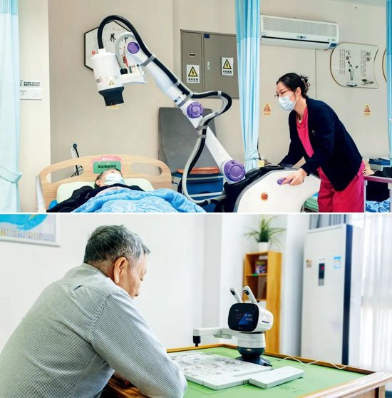 在深圳市养护院,理疗室有AI康复治疗机器人,机器臂扫描身体后,能快速定位,给老人按摩、艾灸。李锡坡曾在一个图书馆看到一款下棋机器人,会下象棋、围棋,内置数百种棋谱,他也引进到养护院,有老人每天午休都要和它对弈几盘。