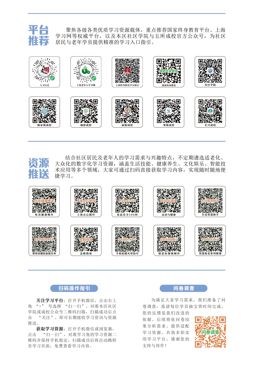 不久前,城桥镇成人学校城桥校区的教师志愿者团队还走进位于城西口袋公园的早市便民广场,设置宣传展板、现场指导“码上学”以及发放银发数字教育学习手册。其中,宣传展板精准对接老年人高频数字需求,科学划分抖音使用、智能手机操作、便民就医等核心板块,整合了40余个实用学习二维码,“一码一技能”的设计让数字学习内容更易于老年人理解和掌握。“视频一步一步教,特别清晰,学了之后不管是找美食、查旅游攻略都能用得上,对我们老年人出行、生活都很有帮助。”一位市民说。